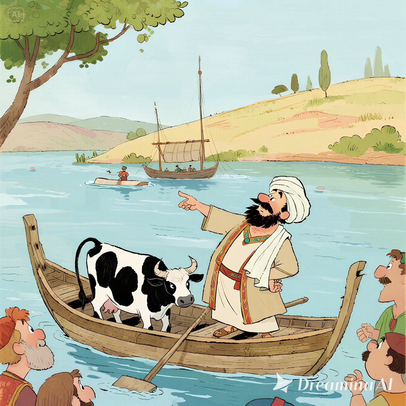 Ông lùa bò lên thuyền, rồi ra hiệu kéo dây đo mực nước. Xong, ông bảo dắt bò lên bờ. Sau đó Nasredin cho chất đá lên thuyền đến khi nước dâng đúng mực lúc trước.