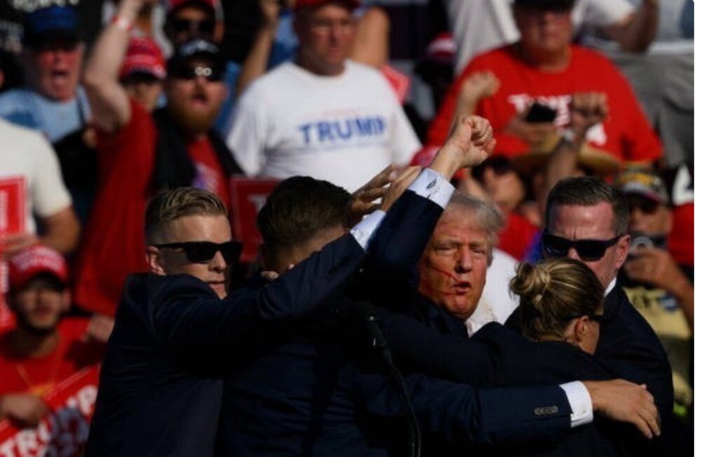 Ông Donald Trump được mật vụ Mỹ hộ tống rời khỏi bục diễn thuyết trong cuộc vận động tranh cử ở thành phố Butler, bang Pennsylvania sau khi xảy ra vụ nổ súng, ngày