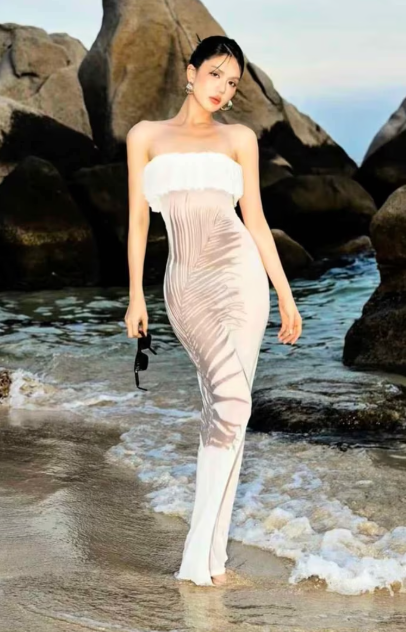 Trong ảnh được ghi lại bằng camera thường, Ngọc Trinh diện váy ôm sát cơ thể, tông màu nude giúp tôn dáng rõ đường cong.