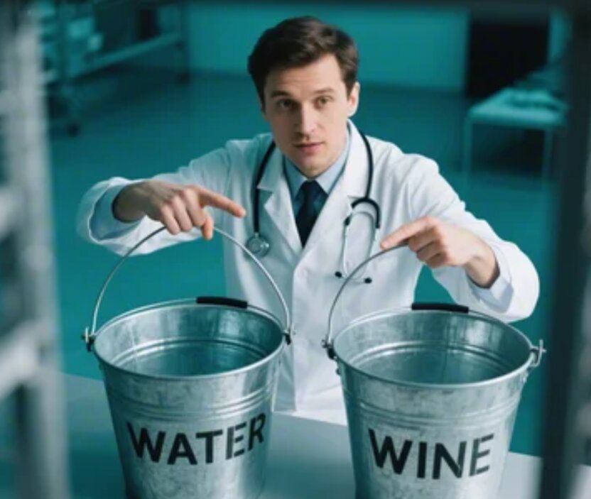 Để minh chứng, bác sĩ đem ra một xô nước, một xô rượu và một con bò. Con bò liền đi đến xô nước và uống nước.