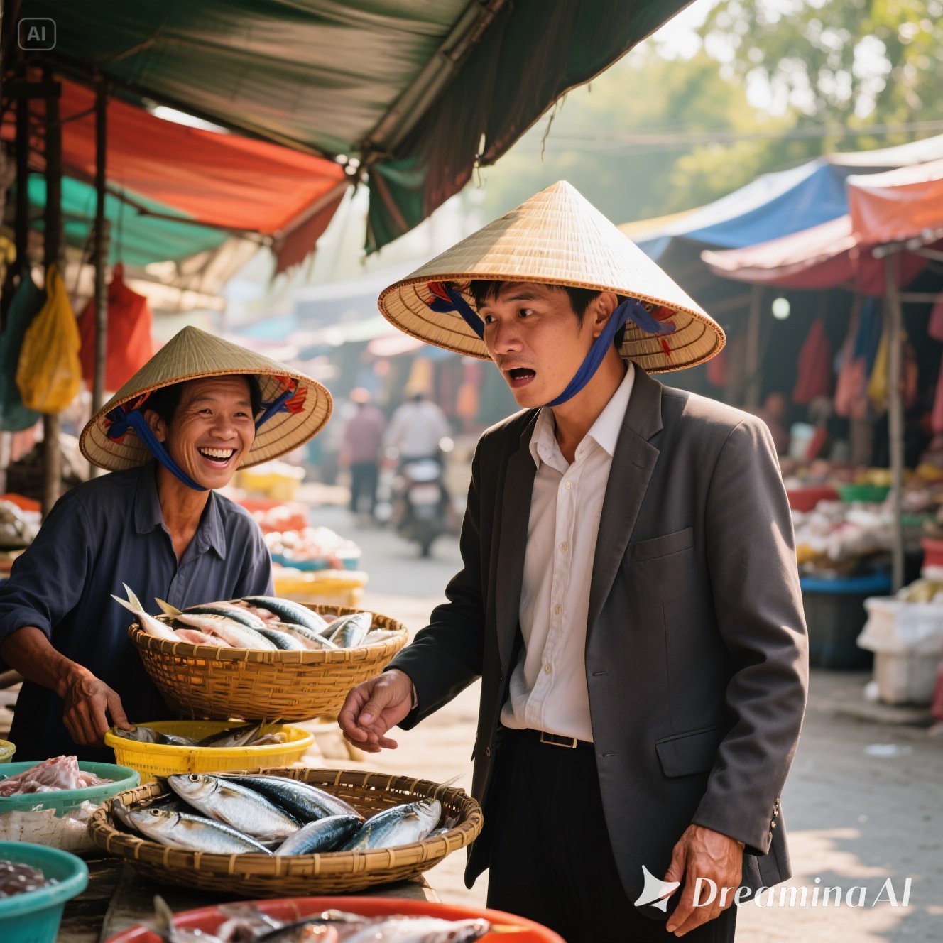 Một anh Việt kiều lần đầu về quê sau 20 năm sống ở nước ngoài. Hôm đó anh ra chợ quê mua cá: