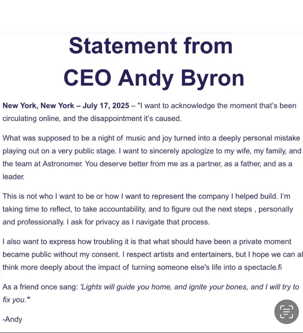Trên mạng xã hội đang lan truyền một bức "tâm thư" của Byron gửi tới nội bộ công ty. Trong thư, ông thừa nhận "khoảnh khắc đáng xấu hổ" đang được lan truyền với tốc độ chóng mặt, đồng thời gửi lời xin lỗi chân thành tới "vợ, gia đình và toàn thể nhân viên Astronomer" vì những ảnh hưởng tiêu cực mà họ không đáng phải nhận.