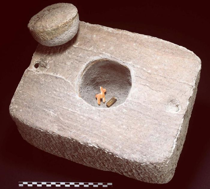 Nhóm chuyên gia còn tìm thấy một lá cuộn hình trụ dát vàng (2,5 x 1,3 cm), nằm cạnh tượng lạc đà không bướu trong chiếc hộp đá.