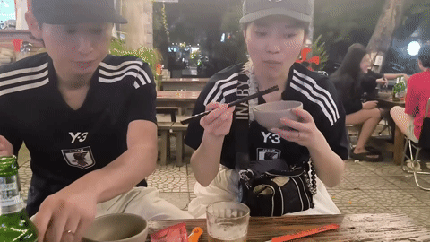 Hai vị khách Nhật Bản lần đầu tới Việt Nam được thử đậu rán chấm mắm tôm. Ảnh: YouTube KiKi.Jp