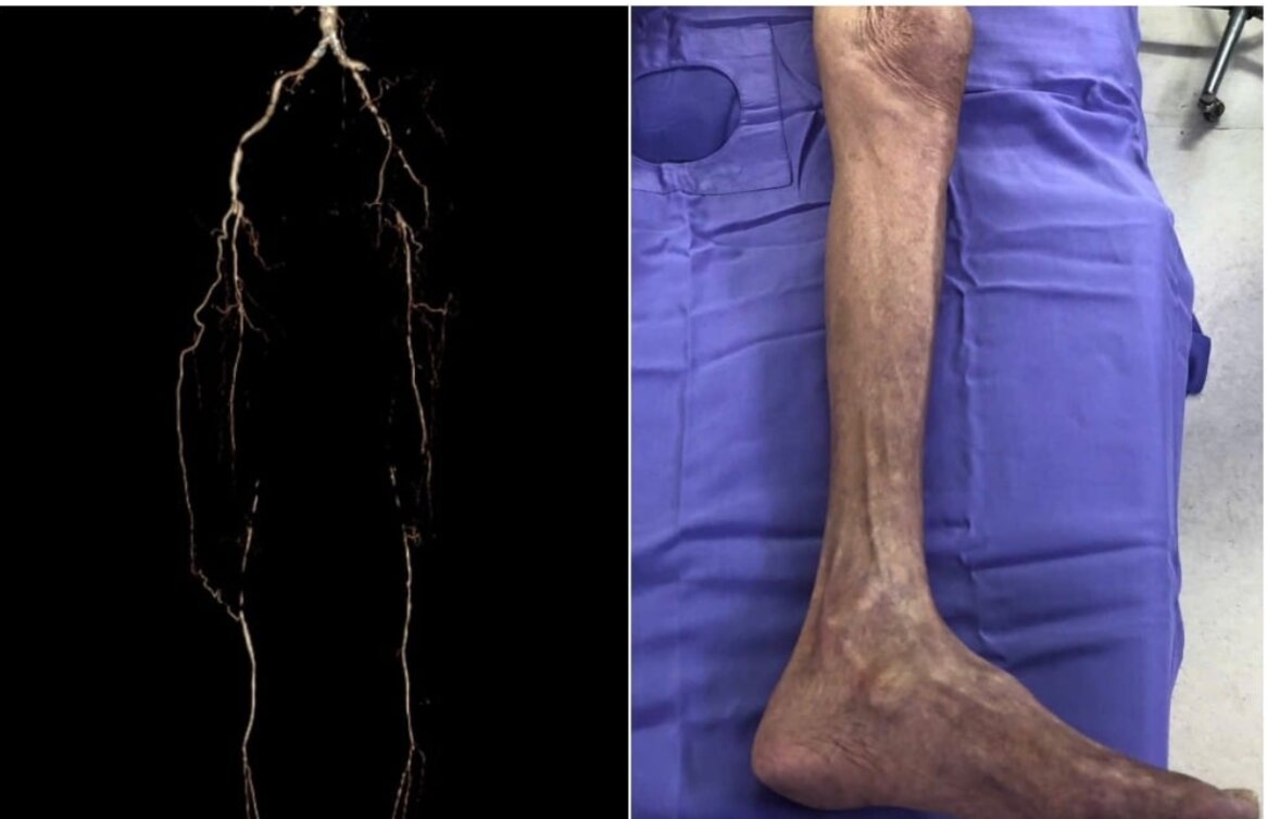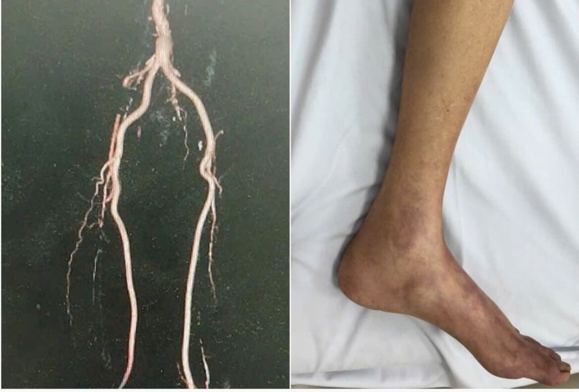 Qua thăm khám, các bác sĩ không bắt được mạch chi dưới hai bên, có dấu hiệu thiếu máu chi nghiêm trọng. Kết quả chụp cắt lớp vi tính cho thấy người bệnh bị hẹp và tắc động mạch nhiều đoạn từ động mạch chủ bụng đến các đoạn chậu, đùi và cẳng chân hai bên.