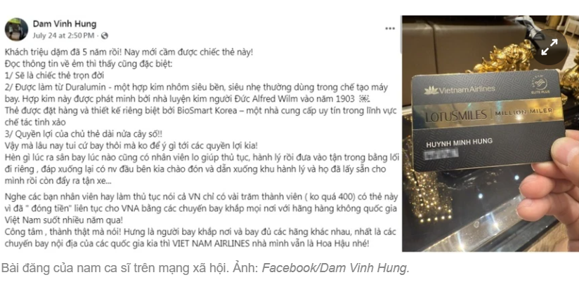 Vừa qua, ca sĩ Đàm Vĩnh Hưng đã đăng tải lên trang cá nhân về việc trở thành thành viên cao cấp, nhận được thẻ "triệu dặm" của hãng hàng không. Chiếc thẻ được cấp trọn đời, mang đến nhiều ưu đãi dành riêng cho hội viên tích lũy đủ 1 triệu dặm trên chuyến bay của hãng.