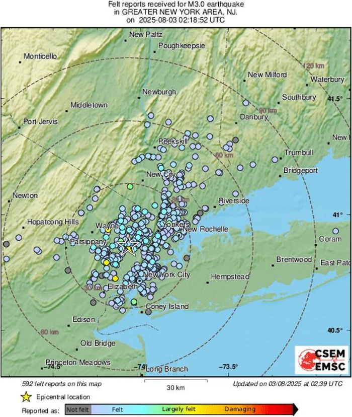 Hãng tin RT trích dẫn thông tin của Cơ quan Khảo sát Địa chất Mỹ (USGS) cho hay, trận động đất xảy ra lúc 22h18 giờ địa phương ngày 2/8 và tâm chấn được xác định nằm ở độ sâu khoảng 10km tại khu ngoại ô Hasbrouck Heights của bang New Jersey.
