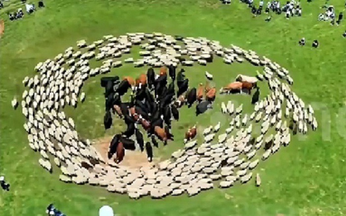 Vào ngày 28/7, một cảnh tượng bất thường đã diễn ra tại đồng cỏ Trác Phụ, thị trấn Tuyết Sơn, huyện Vị Ninh, tỉnh Quý Châu, Trung Quốc, một đàn cừu bắt đầu vây quanh một đàn gia súc, hoàn toàn bao vây chúng và khiến những con bò không thể di chuyển.