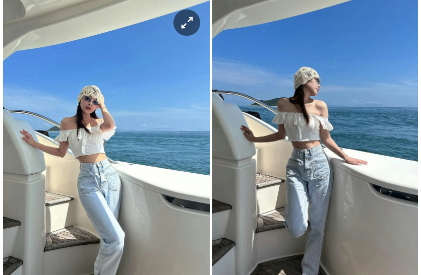Điểm nhấn của outfit nằm ở chiếc mũ len móc crochet màu kem, kết hợp cùng kính râm. Nữ diễn viên tạo nhiều dáng nhí nhảnh trên du thuyền sang trọng. "Có lẽ trên gương mặt có rất nhiều câu chuyện. Nhưng mỗi câu chuyện đều thật đáng yêu và sâu sắc”, người đẹp chú thích dưới loạt ảnh.