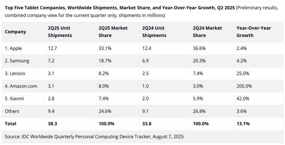 Hãng nghiên cứu thị trường IDC vừa cho công bố ra doanh số bán ra của các máy tính bảng toàn cầu trong quý 2 năm 2025.