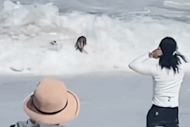 Giữa khoảnh khắc hỗn loạn, một thanh niên mặc áo trắng đang có mặt trên bờ bất ngờ chạy thẳng xuống biển. Sóng lớn liên tiếp ập tới khiến anh loạng choạng rồi bị hất ngã, phải quay vào bờ. Không bỏ cuộc, anh lập tức lao ra lần nữa, cố gắng tiếp cận cô bé nhưng liên tiếp bị đẩy lùi.