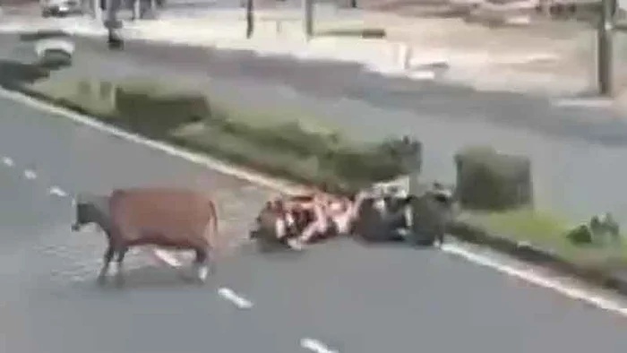 Theo như có hai người đi xe máy bị thương và phương tiện hư hỏng nặng trong khoảnh khắc con bò lao qua đường khiến người điều khiển xe máy không kịp phản xạ. Nguyên nhân xuất phát từ việc một con bò bất ngờ băng ngang đường trước đầu các phương tiện đang lưu thông bất ngờ lao qua đường, húc ngã hai người đi xe máy gây xôn xao.