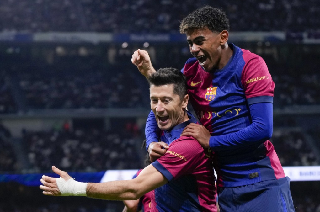 Robert Lewandowski mừng bàn cùng Lamine Yamal trong trận Barca thắng Real 4-0 trên sân Santiago Bernabeu ở Madrid, Tây Ban Nha ngày 26/10/2024. Ảnh: AP