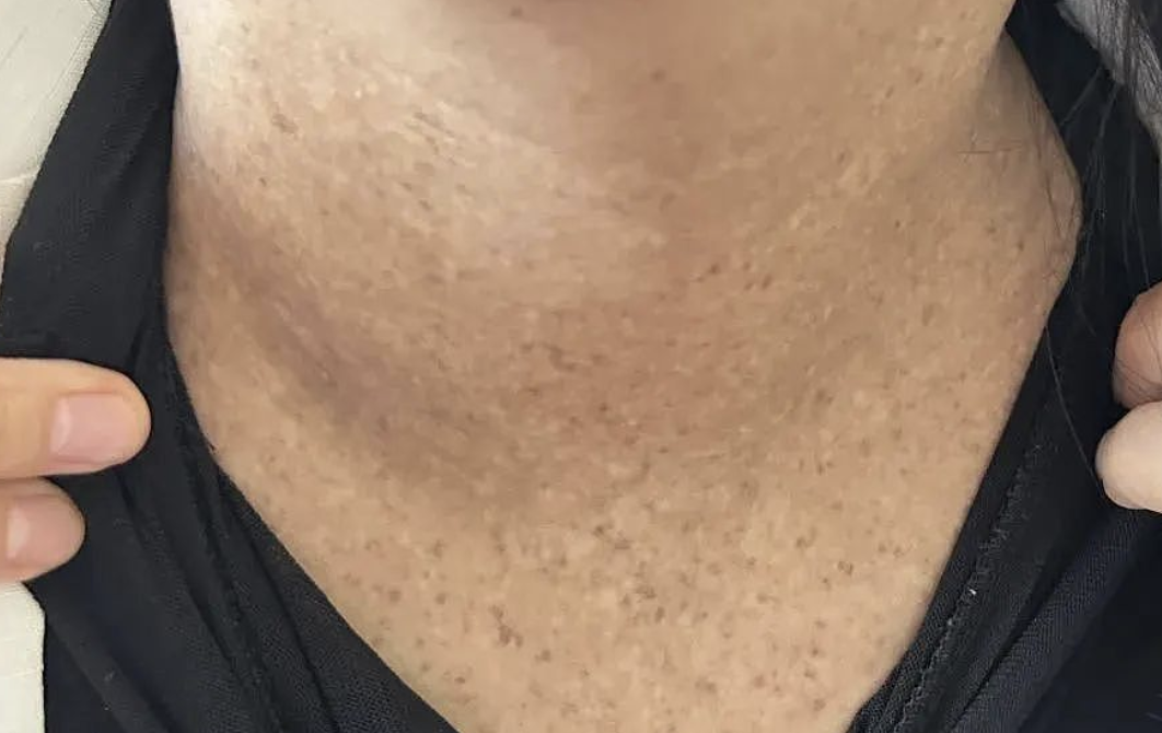 Bẵng đi vài tháng, vùng da cổ này ngày càng thâm lại và xuất hiện các đốm đen nhỏ li ti. Một lần nữa, cô Trần tự an ủi mình đây là dấu hiệu của tuổi tác, chăm dưỡng da một chút là sẽ ổn. Nhưng mọi chuyện không đơn giản như cô nghĩ, tình trạng này lan ra cả tay, chân và nhiều nơi trên cơ thể với những cục li ti cứng như hạt gạo. Đáng sợ hơn là cô bắt đầu cảm thấy khó thở và mệt mỏi ngay cả khi vận động nhẹ.