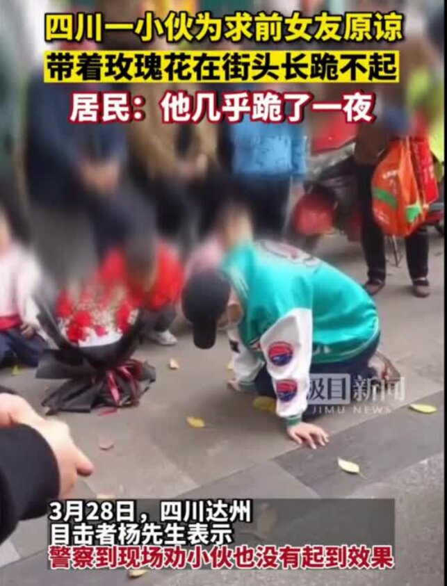 Theo South China Morning Post (SCMP), vụ việc xảy ra ngày 28/3/2023. Từ 13h hôm đó đến 10h sáng hôm sau, một nam thanh niên đã quỳ trước tòa nhà văn phòng nơi bạn gái cũ làm việc với một bó hoa hồng lớn trên tay.