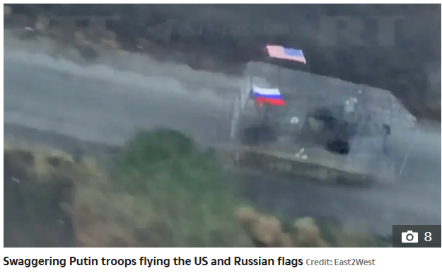 Và giờ đây - trong một động thái dường như là một đòn giáng mạnh vào Zelensky - những thước phim kinh hoàng cho thấy quân đội của Vlad tung bay cờ Mỹ bên cạnh quốc kỳ Nga.