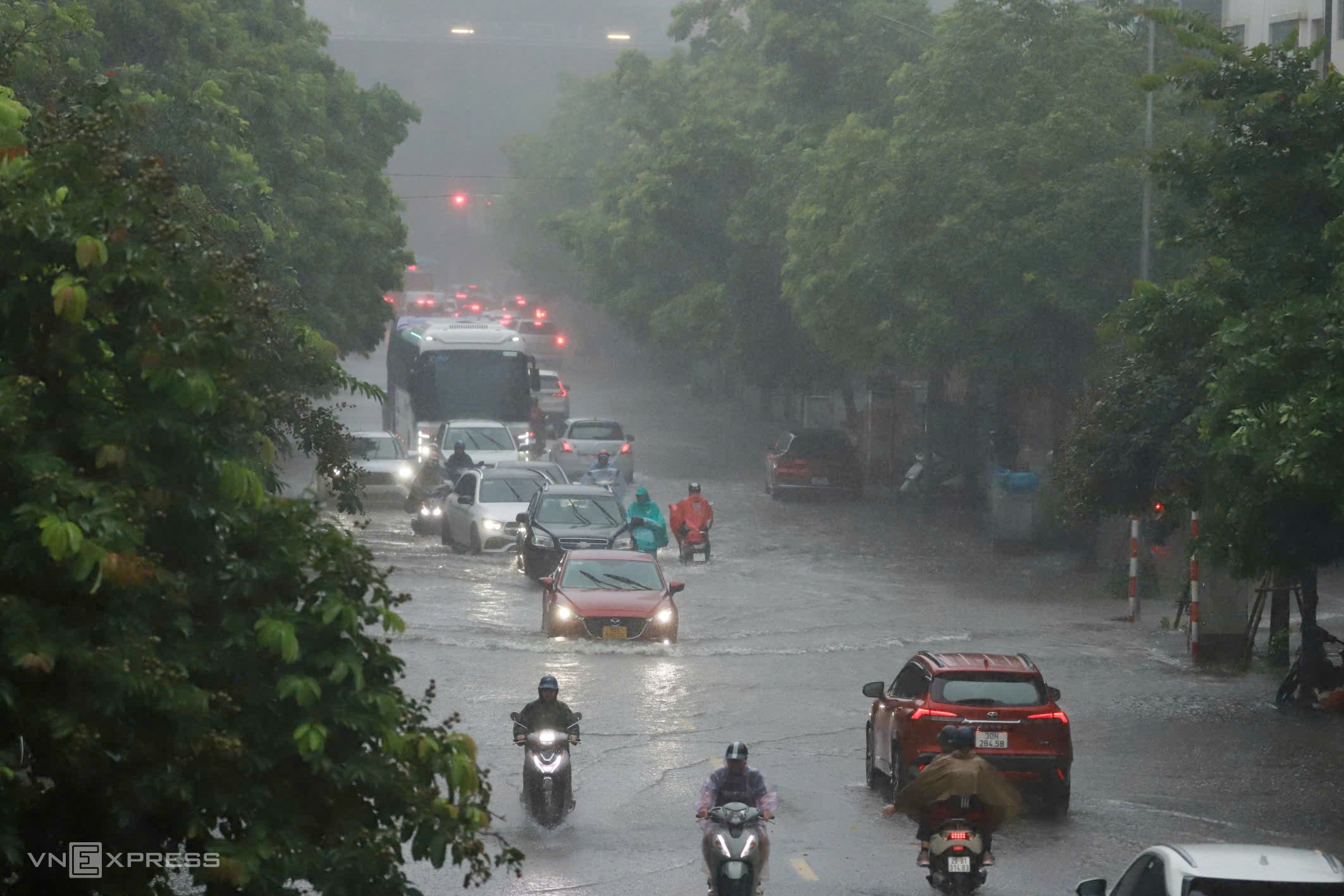 Nhiều tuyến phố Thủ đô ngập sâu, hàng loạt xe chết máy, giao thông hỗn loạn do ảnh hưởng của hoàn lưu bão Kajiki, sáng 26/8.