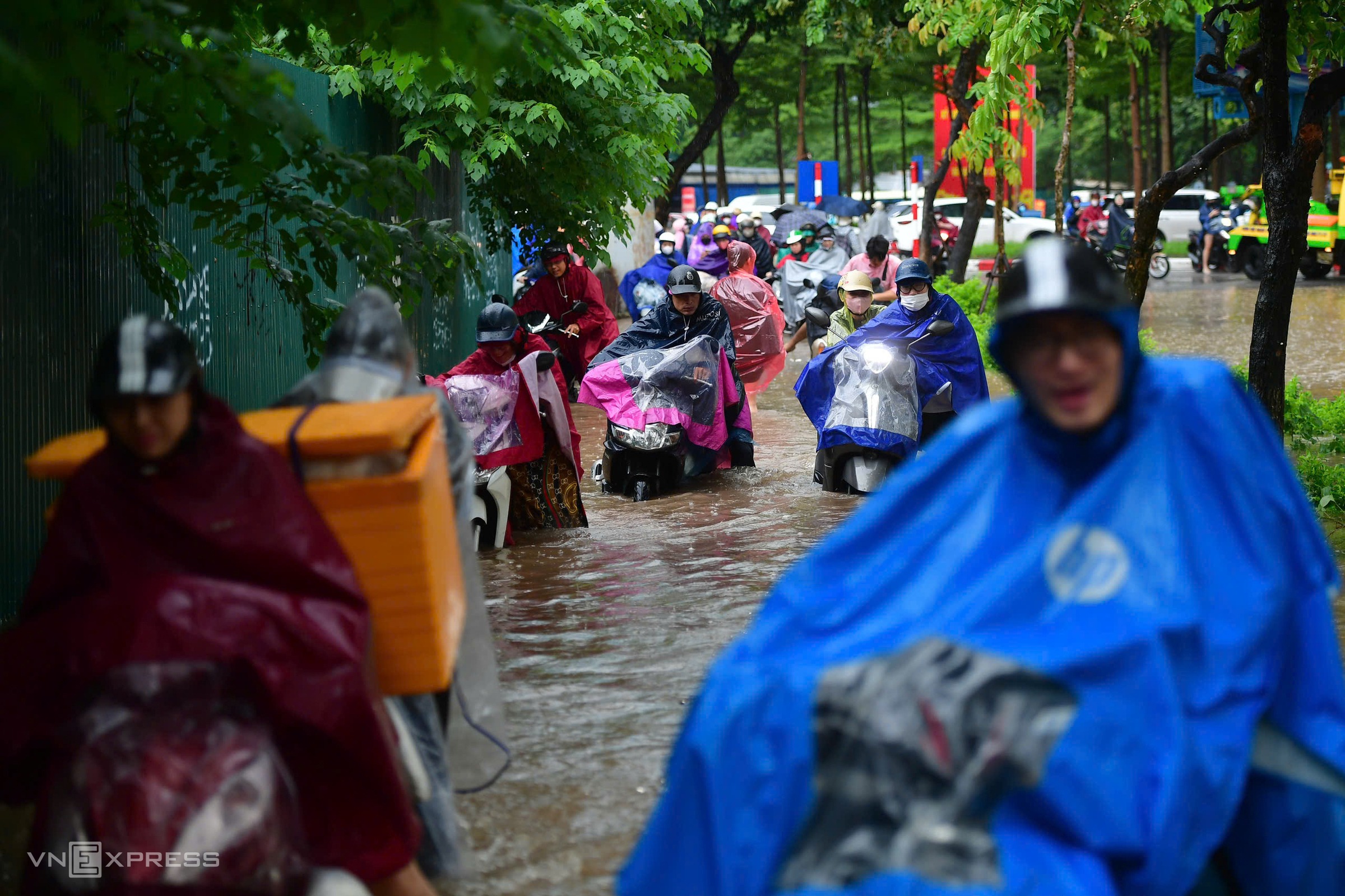 Đường Mỹ Đình ngập tới gần yên xe. Ảnh: Nguyễn Giang