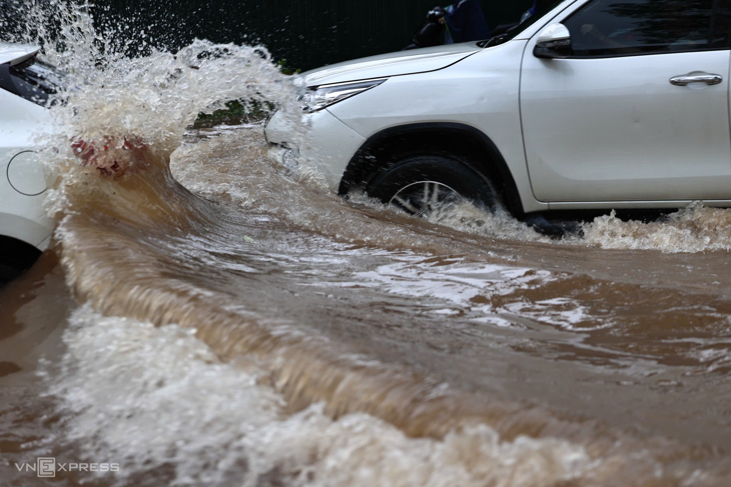 Ôtô chạy tạo thành sóng lớn trên đường Trần Thái Tông. Một số xe chết máy được cứu hộ di dời. Ảnh: Quỳnh Trần