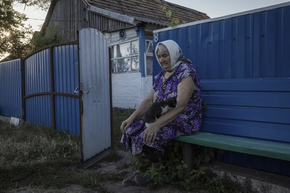 Alla Khoruzha ngồi bên ngoài ngôi nhà của bà ở làng Petrivka Druha, vùng Donetsk, miền đông Ukraine. Ảnh: WP