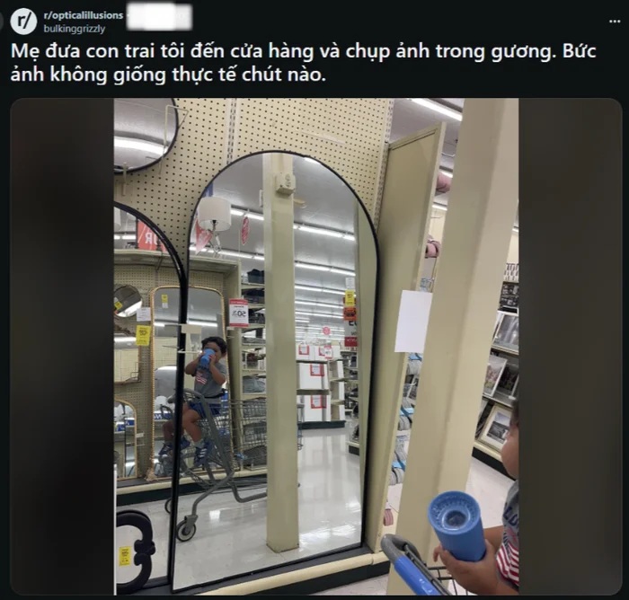 Một bà ngoại tại Mỹ đã trải nghiệm điều này theo cách khiến bà hoàn toàn bất ngờ. Trong một bài đăng trên diễn đàn Reddit, bà chia sẻ hình ảnh chụp cháu trai 2 tuổi trong một siêu thị, khi cậu bé ngồi trong xe đẩy uống nước. Tuy nhiên, điều kỳ lạ là hình ảnh phản chiếu trong gương lại không trùng khớp với tư thế và hành động thực tế của cháu. Bài đăng nhanh chóng thu hút sự chú ý của cộng đồng mạng.