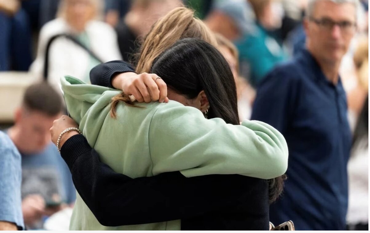 Những người đến tham dự lễ cầu nguyện tưởng niệm tại Trường Trung học Academy of Holy Angels, đã ôm chặt nhau trong nỗi đau mất mát, sau vụ xả súng xảy ra buổi sáng cùng ngày tại Nhà thờ Annunciation ở Minneapolis.