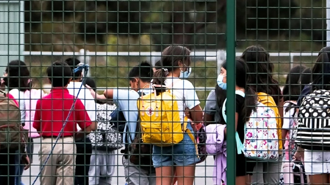 Học sinh tiểu học chuẩn bị vào lớp ở Santa Ana, quận Cam, bang California. Ảnh: Voice of OC