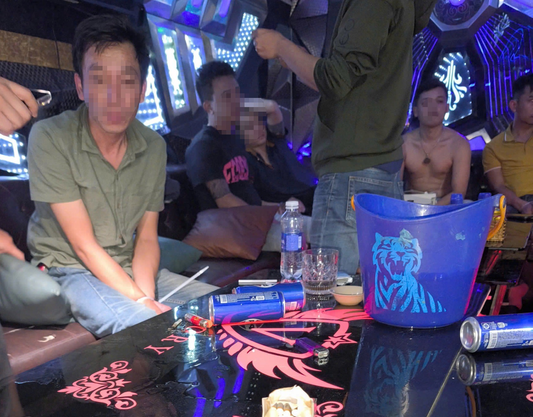 Tại phòng 302, công an bắt quả tang 9 đối tượng cùng tang vật gồm ketamine, thuốc lắc và nhiều dụng cụ sử dụng ma túy. Qua kiểm tra nhanh, 7/9 đối tượng dương tính. Trong đó, Trần Hữu Nguyên Khoa (SN 1990, trú phường An Khê, TP Đà Nẵng) và Hồ Ngọc Định (SN 1993, trú phường Hòa Xuân, TP Đà Nẵng) được xác định là người mua, chuẩn bị và tổ chức sử dụng ma túy cho nhóm.