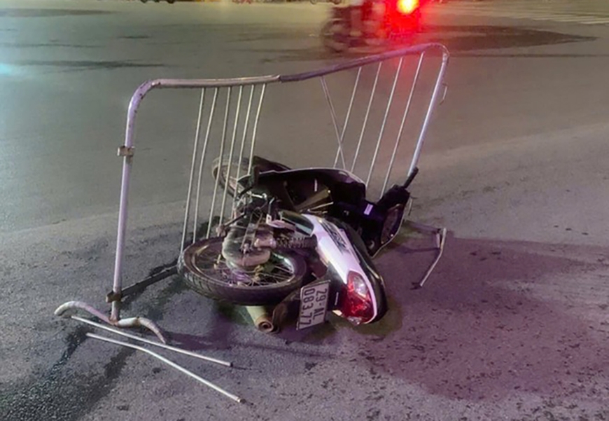 Xe máy của hai nghi phạm tông méo cả rào chắn đường. Ảnh: Minh Tú