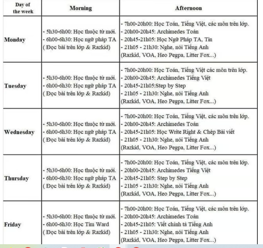 Theo thời khóa biểu này, một ngày học tập của cháu bé được bắt đầu từ rất sớm, lúc 5 giờ 30 phút sáng. Buổi sáng từ 5h30 đến 6h30 được dành riêng cho việc học Tiếng Anh, bao gồm: