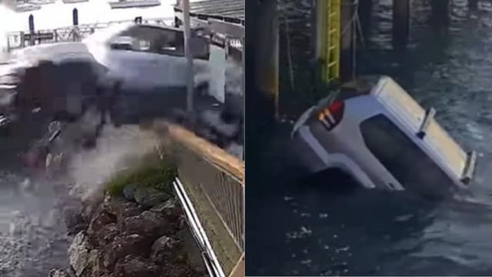 Camera giám sát tại bến đã ghi lại được sự việc đầy kịch tính này. Đoạn clip cho thấy chiếc xe 4WD lao qua trước đầu một chiếc xe buýt và lối đi bộ với tốc độ cao, đâm thẳng vào nhà để xe. Chiếc xe bay khỏi bến tàu trước khi lao xuống nước. Kính và kim loại văng tung tóe khắp nơi.