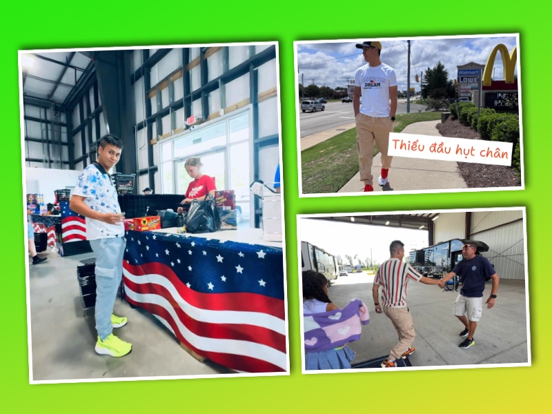 Cắt cảnh sang mùa đông: tuyết rơi ngoài cửa sổ, trong nhà lò sưởi lách tách; rồi lia máy qua hè: cả nhà kéo nhau đi ăn nhà hàng Ý “chính chủ người Ý”, xong ghé warehouse mua pháo, mình đứng pose như poster phim hành động phát hành tại… Walmart. Tua nhanh: handshake với ông kỹ thuật RV, con gái Dory nằm vắt vẻo phòng chờ như diva, còn mình thì mặc áo “AMERICAN DREAM” đi bộ… hụt đầu thiếu chân vì cameraman mê bắt cận cảnh giày hơn mặt 😅