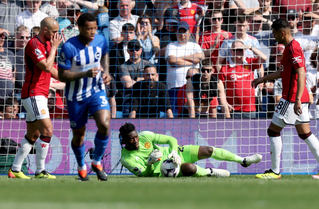 Thủ môn Andre Onana (áo xanh) bắt gọn một cú sút của đối phương trong trận thắng Brighton 2-0 trên sân The Amex ngày 19/5. Ảnh: AP