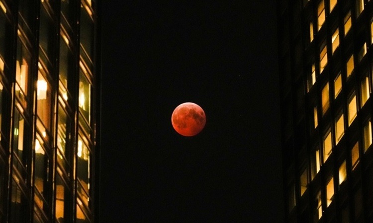 Trăng máu giữa những tòa nhà chọc trời ở trung tâm Chicago hôm 14/3/2025. Ảnh: Kiichiro Sato