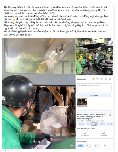 Theo bài đăng, khi một nữ tài xế lớn tuổi chờ lấy đơn, nhân viên quán buông lời thiếu tôn trọng: “Kêu thì ra lấy đi”. Một tài xế khác góp ý cũng bị đáp trả bằng thái độ thách thức. Không ít shipper cho rằng nhân viên quán có lời lẽ thiếu tôn trọng và tuyên bố sẽ không quay lại nhận đơn.