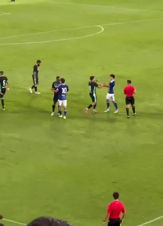 Ngay sau đó, ban huấn luyện hai đội buộc phải tràn vào sân để can thiệp, cố gắng tách cầu thủ ra nhằm ngăn xô xát leo thang.