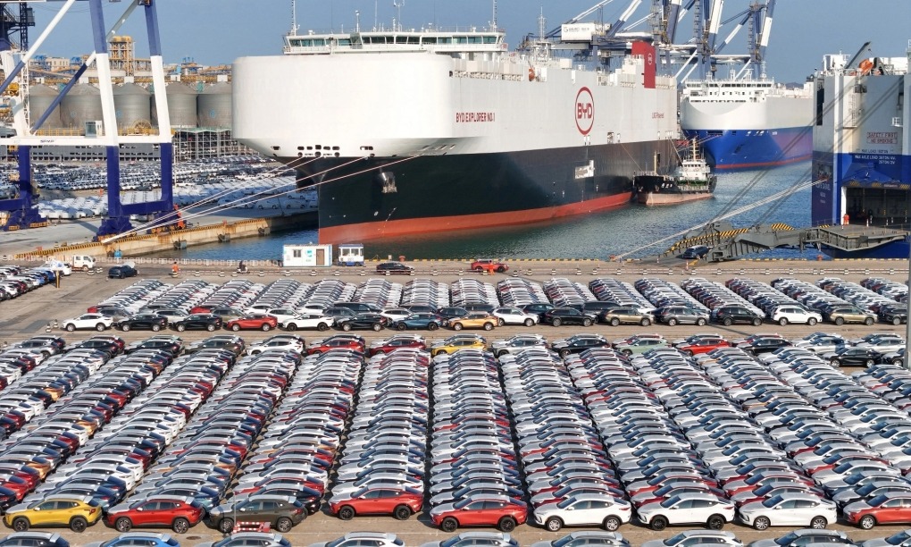 Xe điện chờ được đưa lên tàu BYD Explorer No.1 tại cảng Yên Đài, tỉnh Sơn Đông. Ảnh: AFP