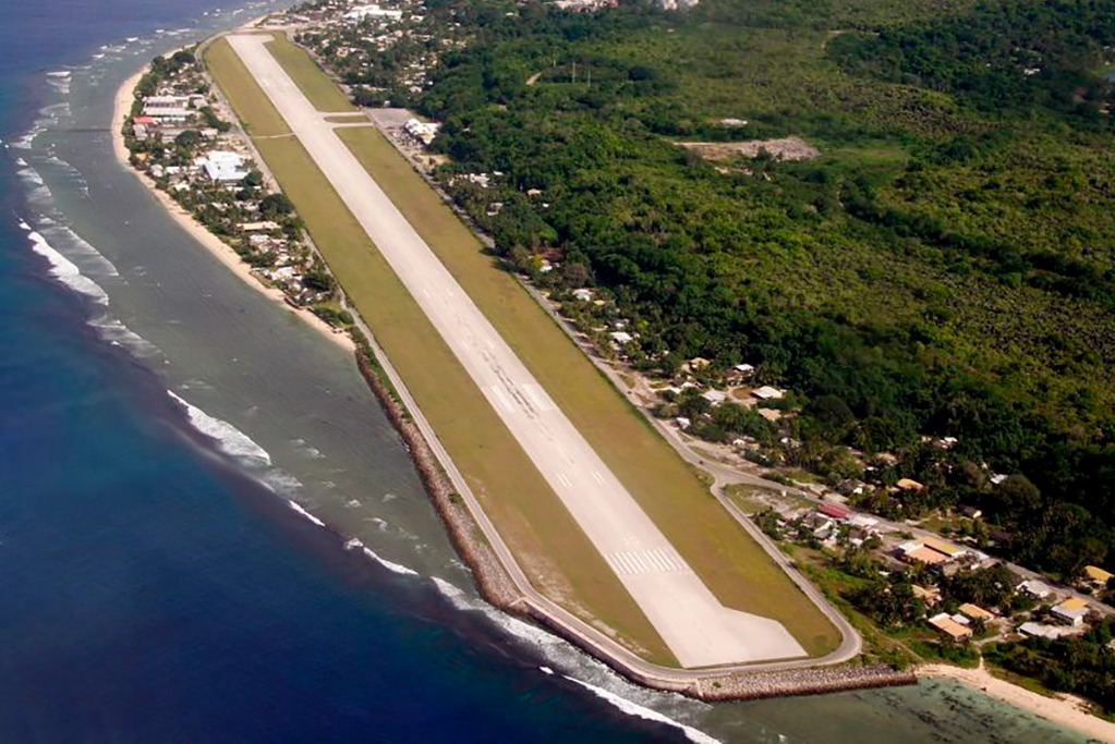Sân bay Amata Kabua ở thủ đô Majuro, quần đảo Marshall có một đường băng dài gần 2,5 km, được xây trên cồn cát hẹp như sợi chỉ nằm giữa Thái Bình Dương. Vì vị trí hẻo lánh, mọi vật liệu để cải tạo đường băng đều phải vận chuyển từ nước ngoài. Ảnh: Islandsim