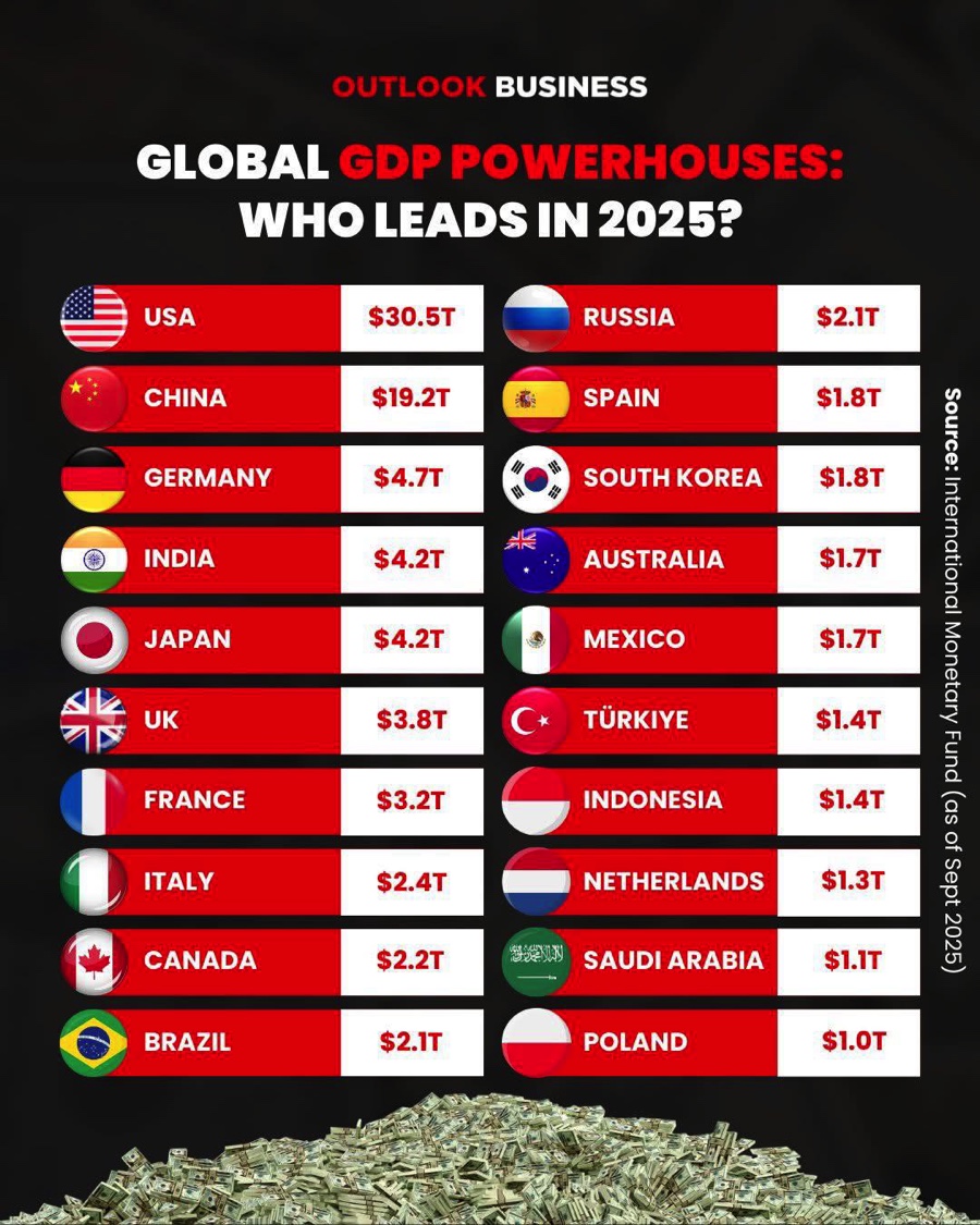 Mỹ vẫn dẫn đầu với 30,5 nghìn tỷ USD, tiếp theo là Trung Quốc 19,2 nghìn tỷ USD, Đức, Ấn Độ và Nhật Bản hoàn thiện top 5.