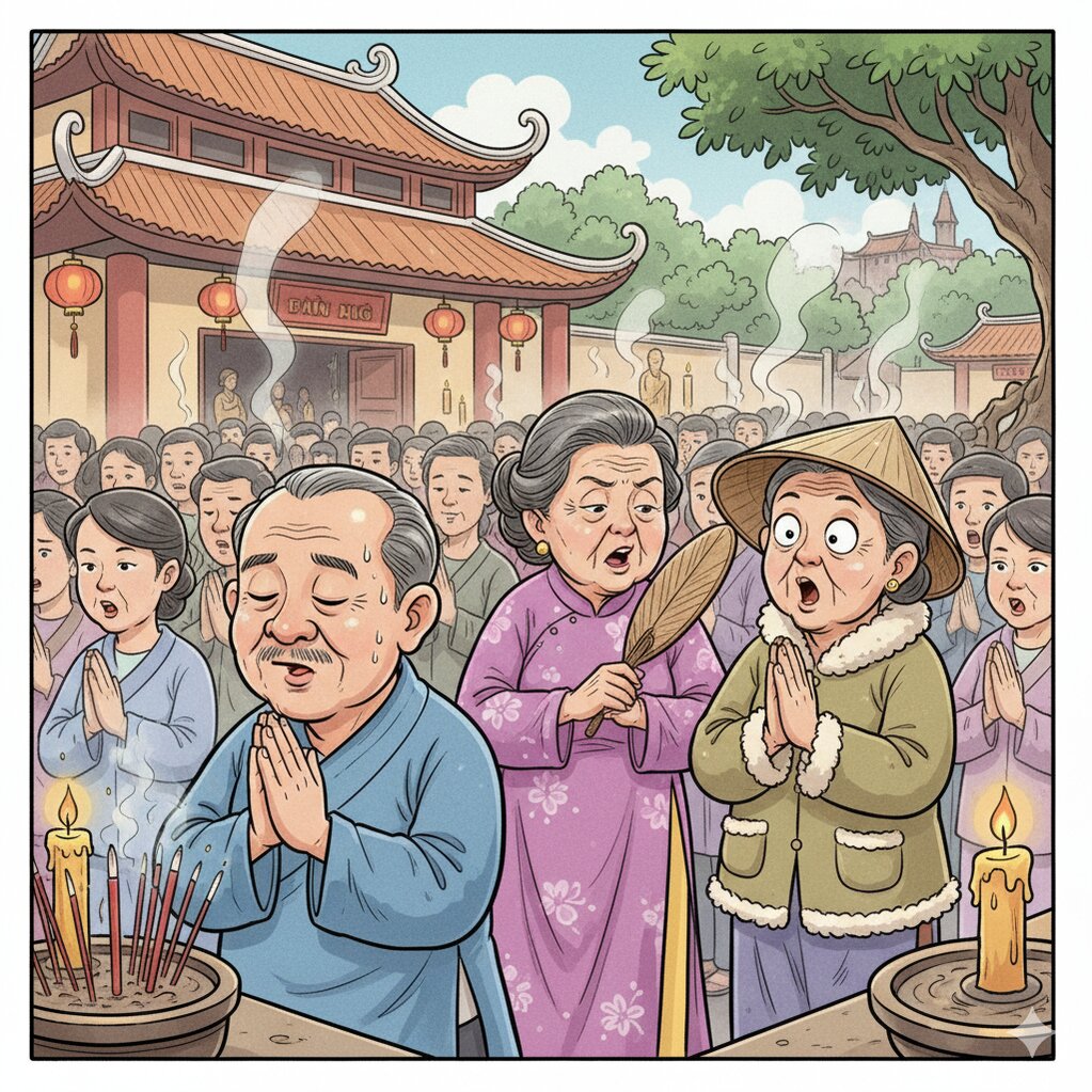 Đầu năm, chùa đông nghịt người. Ai cũng chen nhau tìm một chỗ để khấn vái.
