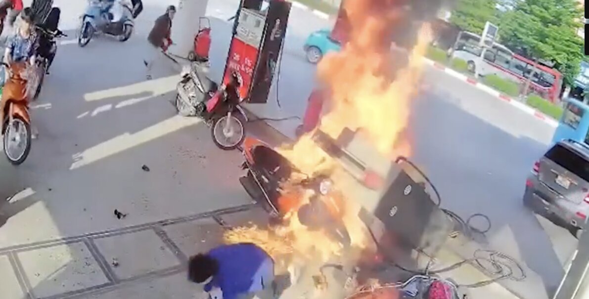 Sự việc chiếc ô tô đang lùi bất ngờ húc đổ trụ bơm xăng, đè lên 2 chiếc xe máy rồi gây cháy dữ dội, xảy ra tại cây xăng Mai Dịch 1 (đường Trần Vỹ, phường Phú Diễn, Hà Nội) chiều 20/9 đã nhận được rất nhiều sự quan tâm của mọi người. Đoạn clip trích xuất từ camera tại cây xăng cho thấy, một nam nhân viên đứng cạnh trụ bơm xăng đã bị lửa bén vào gấu quần.