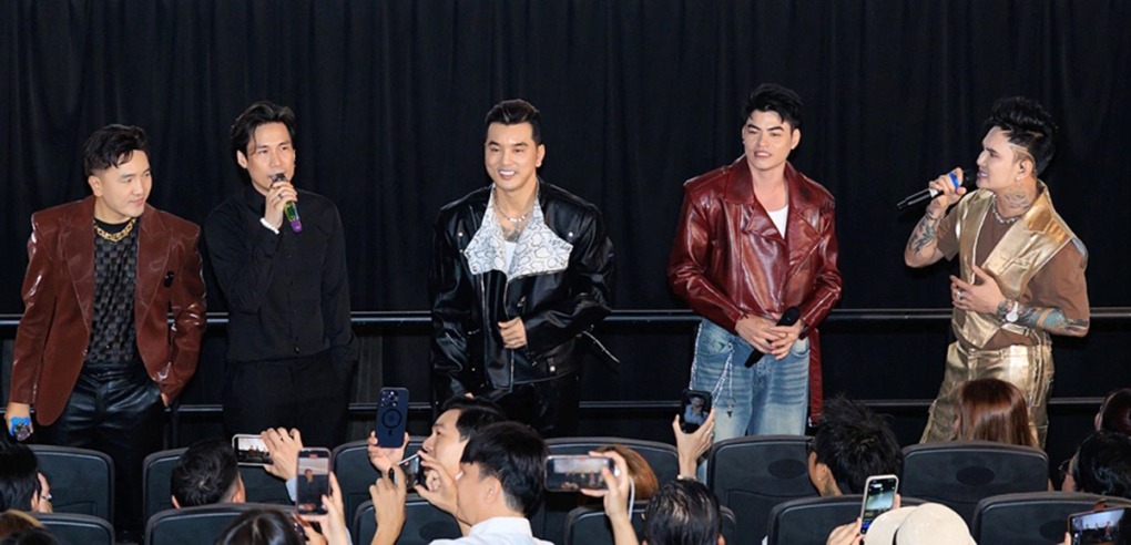 Nhóm Ngũ Hổ Tướng (từ trái sang): Dương Ngọc Thái, Khánh Phương, Ưng Hoàng Phúc, Lưu Hưng, Lâm Chấn Huy tại sự kiện ra mắt sản phẩm chung. Ảnh: Nhân vật cung cấp
