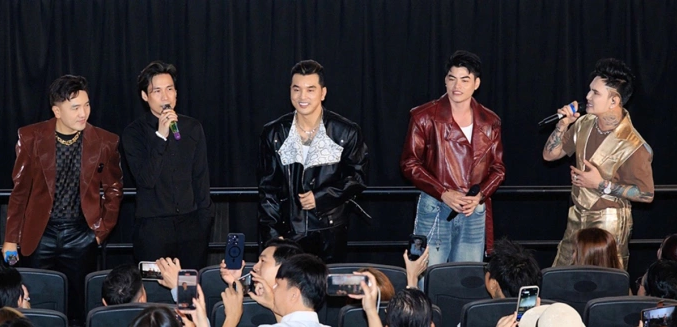 Nhóm Ngũ Hổ Tướng (từ trái sang): Dương Ngọc Thái, Khánh Phương, Ưng Hoàng Phúc, Lưu Hưng, Lâm Chấn Huy tại sự kiện ra mắt sản phẩm chung. Ảnh: Nhân vật cung cấp
