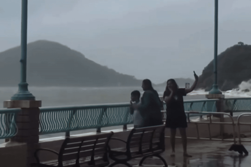 Trong khi người phụ nữ đang giơ điện thoại để chụp selfie, cơn sóng lớn đập vào bờ bất ngờ, hất văng cả 3 người về phía vỉa hè khiến họ ngã xuống đất. Một hàng rào sau đó ngã xuống và đè lên đầu họ. Cả 3 la hét và lồm cồm đứng dậy, dường như không ai bị thương nặng.