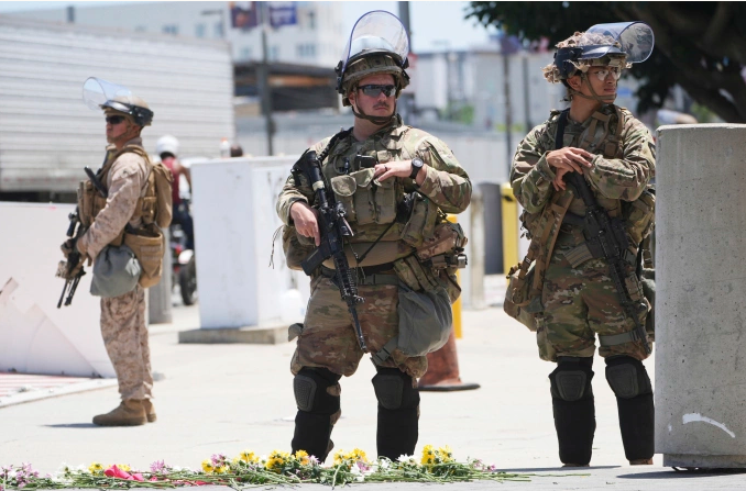 Thành viên lực lượng Vệ binh Quốc gia và Thủy quân Lục chiến Mỹ bảo vệ một tòa nhà liên bang ở Los Angeles, bang California ngày 17/6. Ảnh: AP