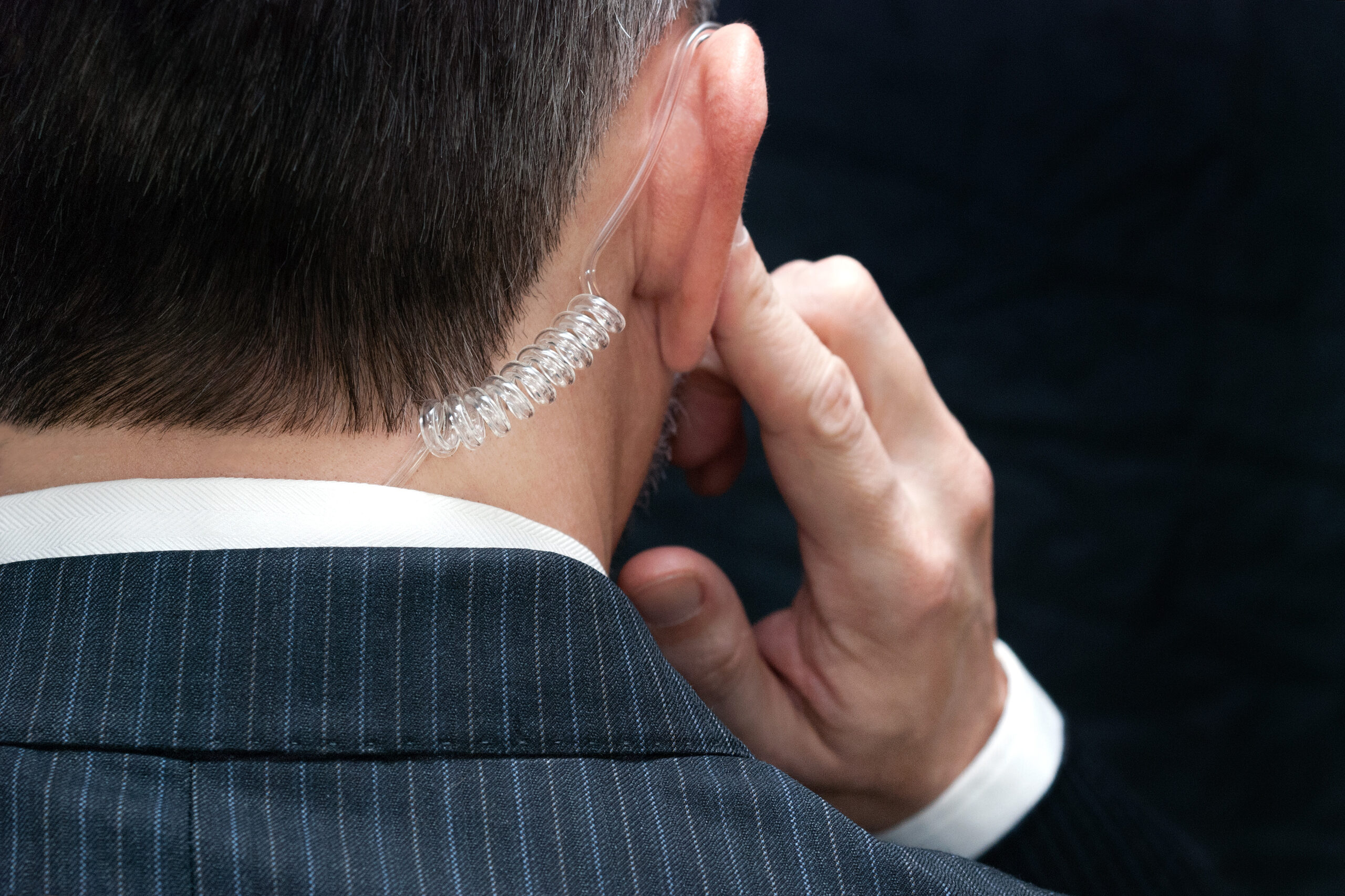 Cận cảnh một mật vụ đang nghe lén qua tai nghe, phía sau. Nguồn ảnh: depositphotos.com