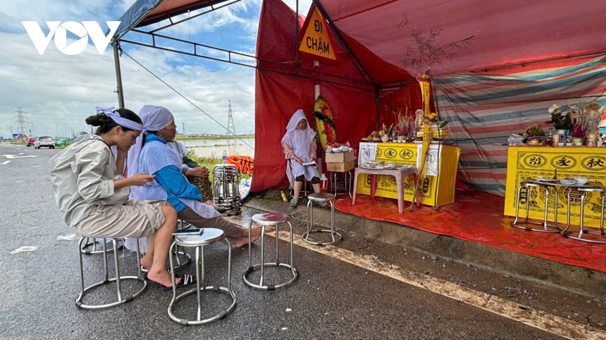 Người nhà nạn nhân dựng lều tạm ven đường để lập ban bàn thờ hai bà cháu, trong lúc chờ nước rút mới có thể an táng.