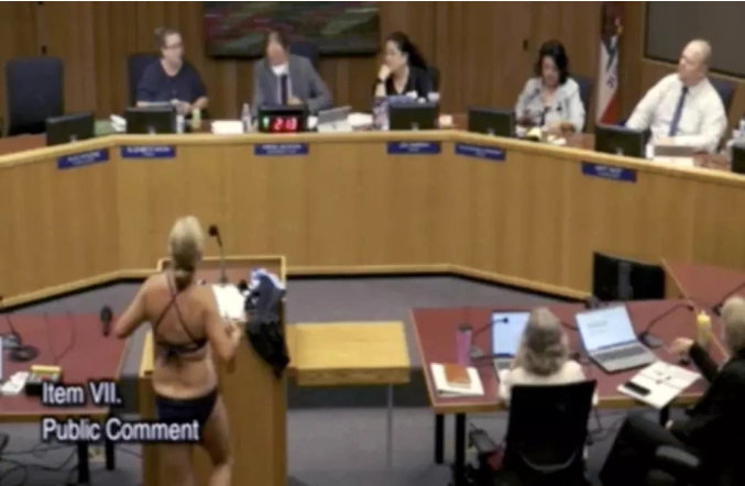 Một phụ nữ cởi quần áo ngoài tại cuộc họp hội đồng trường để phản đối chính sách cho phép học sinh chuyển giới tùy chọn dùng nhà vệ sinh nam hay nữ.
