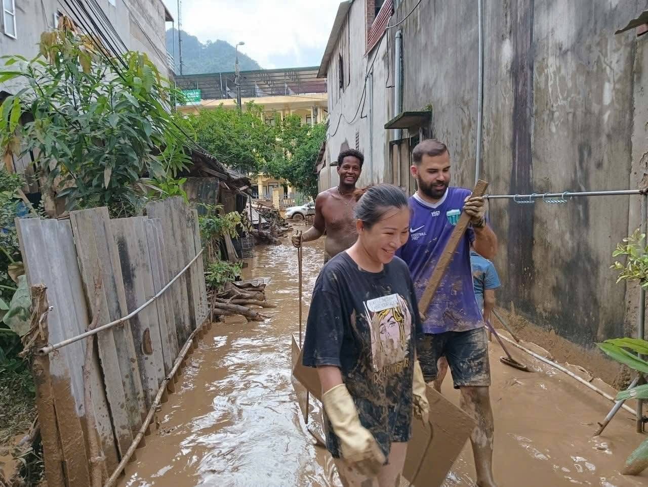 Thấy người dân Hà Giang dọn dẹp nhà cửa, đường sá sau trận lũ, một nhóm du khách nước ngoài không ngần ngại dừng chân, cùng xắn quần quét bùn phụ giúp.