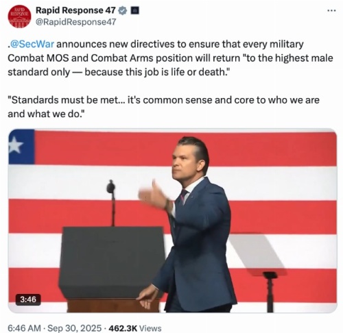 From now on, combat jobs will require the highest standards of fitness and ability. If women can qualify, great. If not, too bad. No more climate change, no more mandatory racist/sexual trainings. Instead, our troops are going to spend their time in the motor pool and on the range. Hegseth touted peace through strength.